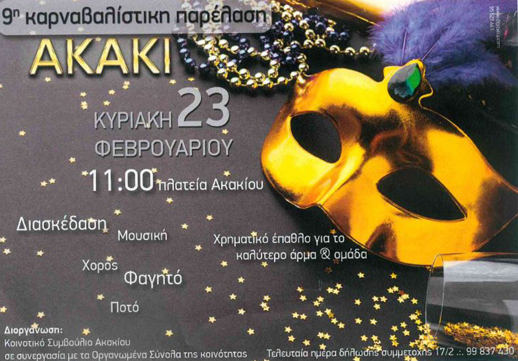 Το Κοινοτικό Συμβούλιο Ακακίου καλεί ομάδες και οργανωμένα σύνολα που επιθυμούν να συμμετέχουν στην 8η Καρναβαλίστικη Παρέλαση που θα πραγματοποιηθεί την Κυριακή 23 Φεβρουαρίου 2020 στις 11:00 π.μ. στην Λεωφόρο Αρχιεπισκόπου Μακαρίου Γ΄ να υποβάλουν